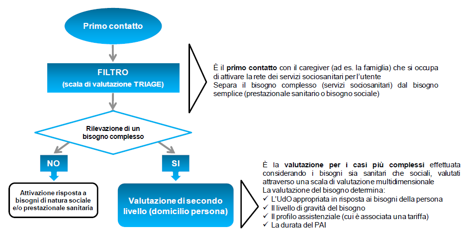 Il processo di valutazione multidimensionale del bisogno si inserisce in un più complesso processo che ha come obiettivo prioritario quello di facilitare l'accesso del cittadino e della sua famiglia alle diverse unità d'offerta sociali e/o sociosanitarie, anche attraverso l'informazione, l'orientamento e l'accompagnamento della persona in condizioni di fragilità, garantendo risposte appropriate ai bisogni rilevati.