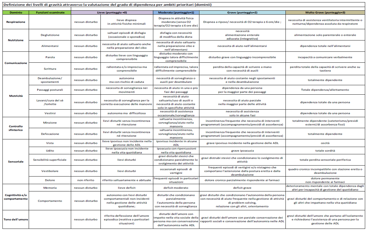 La suddivisione in livelli di gravità presuppone la rilevazione della condizione di bisogno prevalente così da orientare la definizione degli obiettivi di cura e di assistenza e le risorse da mettere in campo in base alla componente sanitaria/sociosanitaria/sociale prevalente.