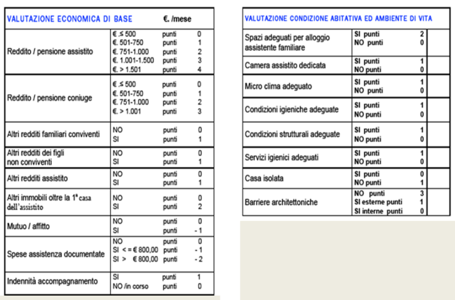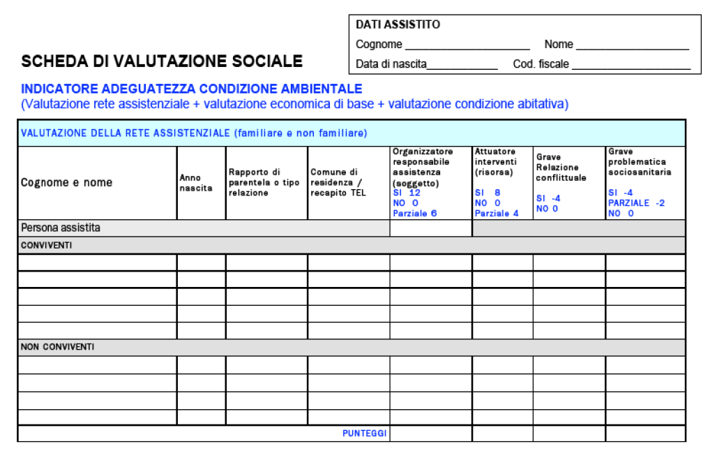 A questo proposito si ritengono utili gli strumenti individuati dalla Società della Salute di Firenze che individuano uno strumento di valutazione della rete assistenziale, della condizione abitativa e dell'ambiente e della capacità economica.